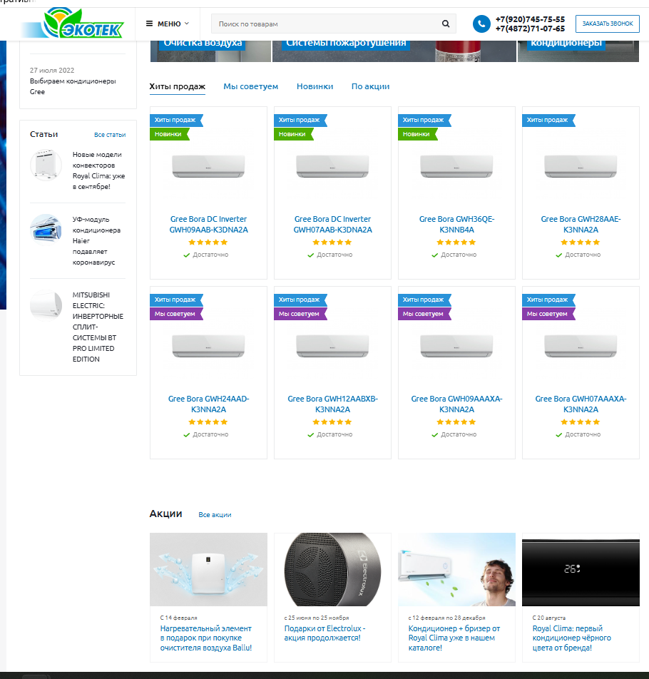 Сайт для компании ООО "Экотек" представляет интернет-магазин с качественно проработанными детальными страницами товаров, на которых выведены основные информация и характеристики товара, приведены технические сведения о продукции.