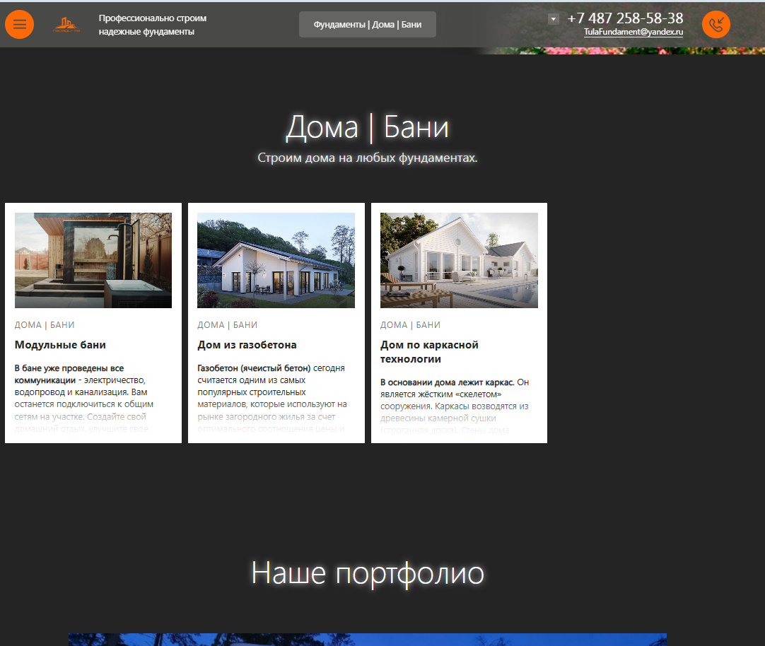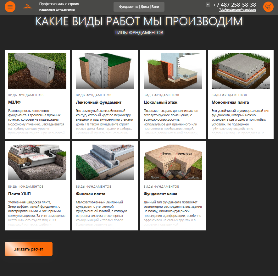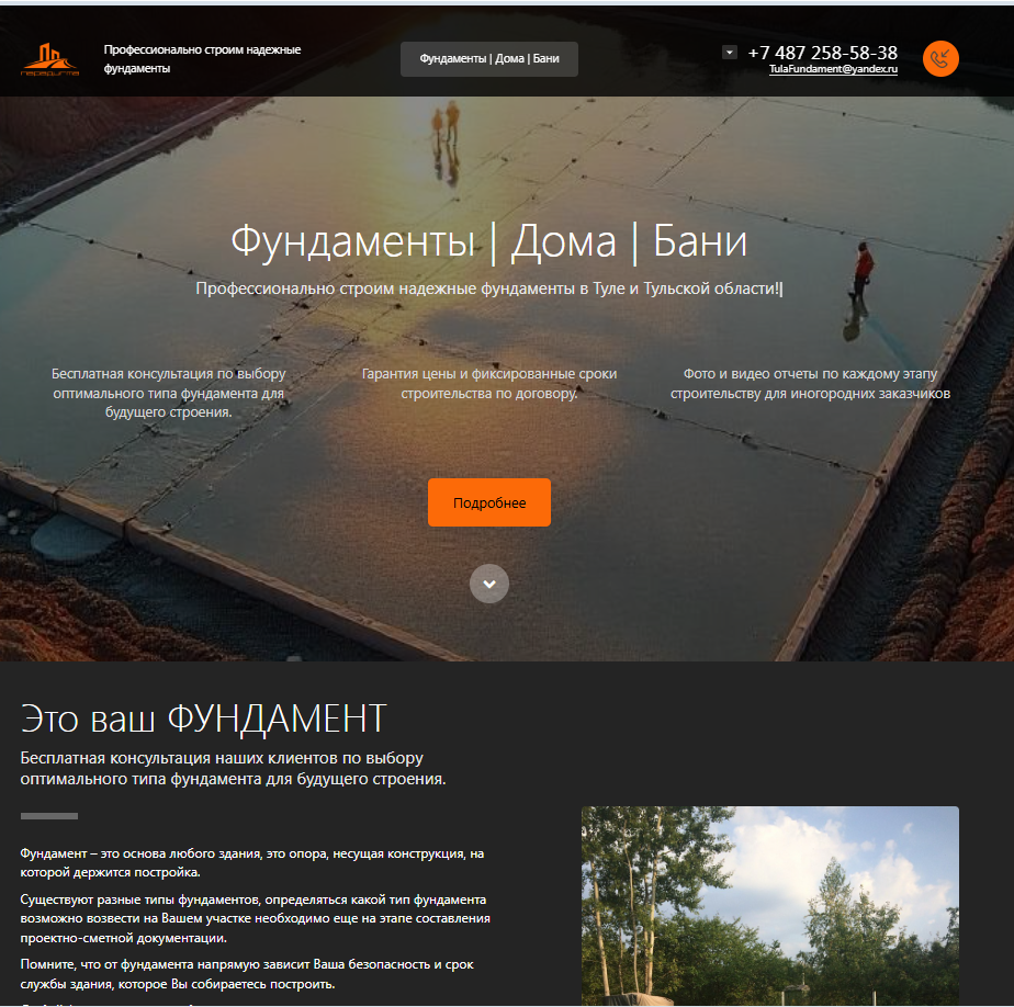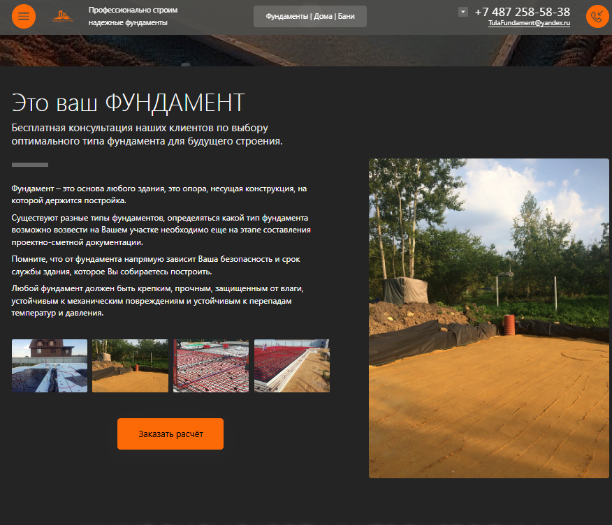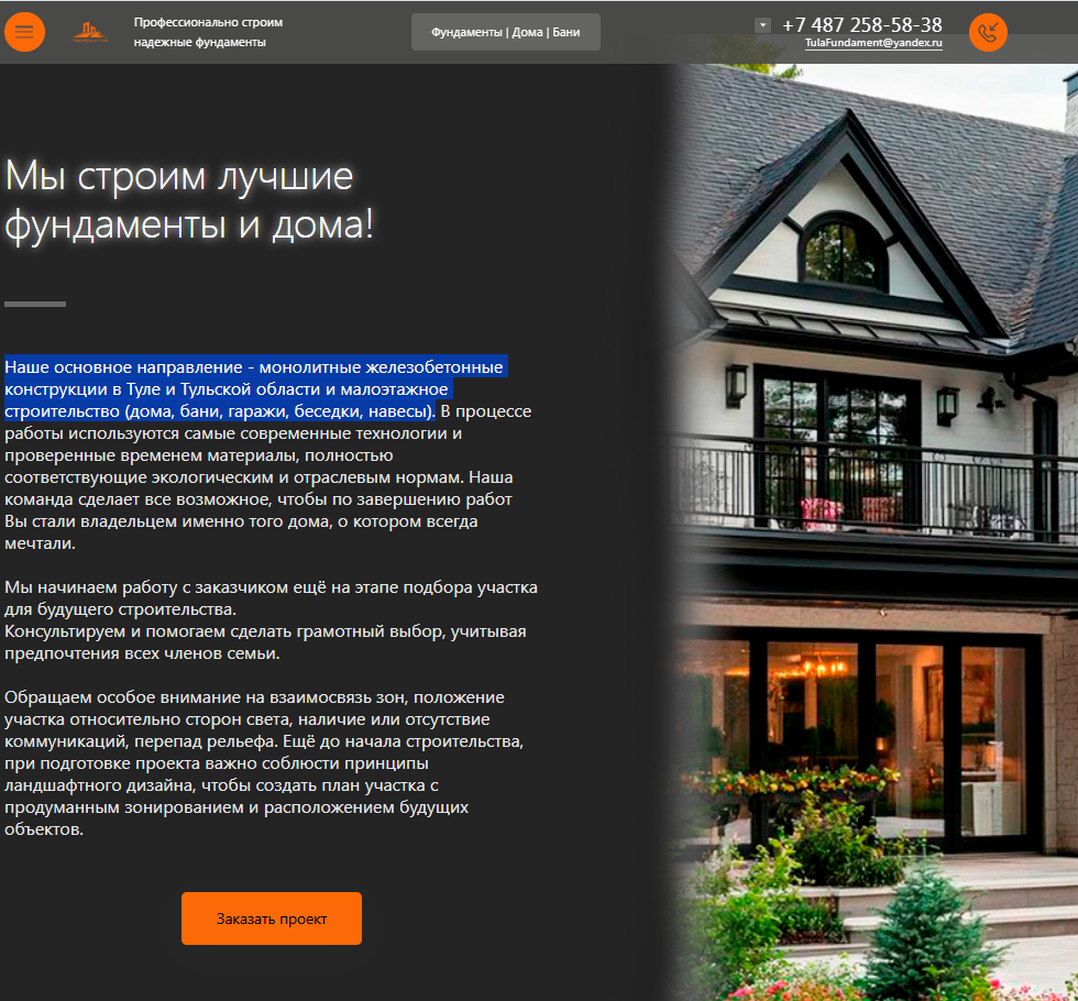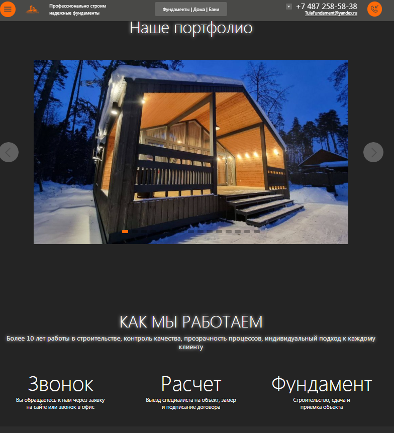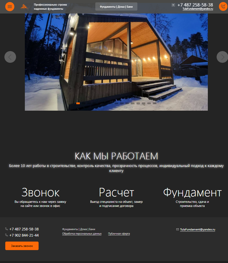 Разработка сайта для компании "Парадигма- Строительство фундаментов, каркасных домов и модульных бань под ключ в Туле"